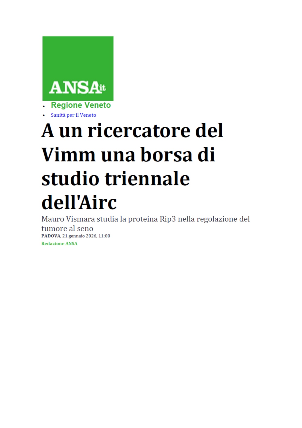 A un ricercatore del Vimm una borsa di studio triennale dell’Airc